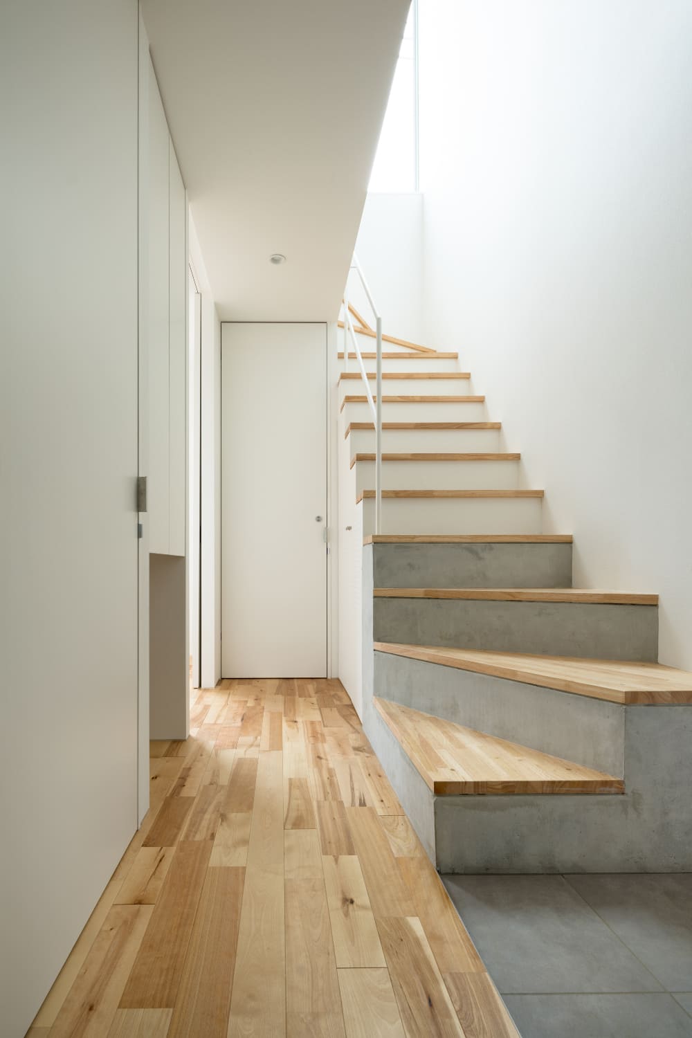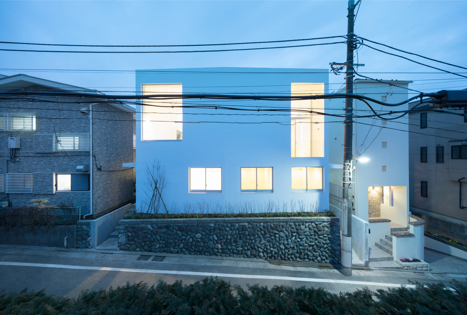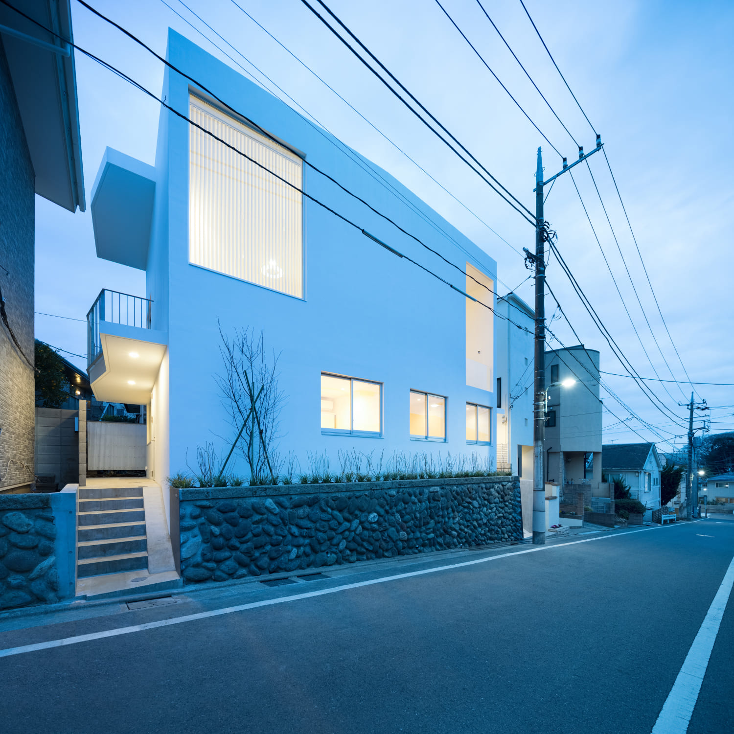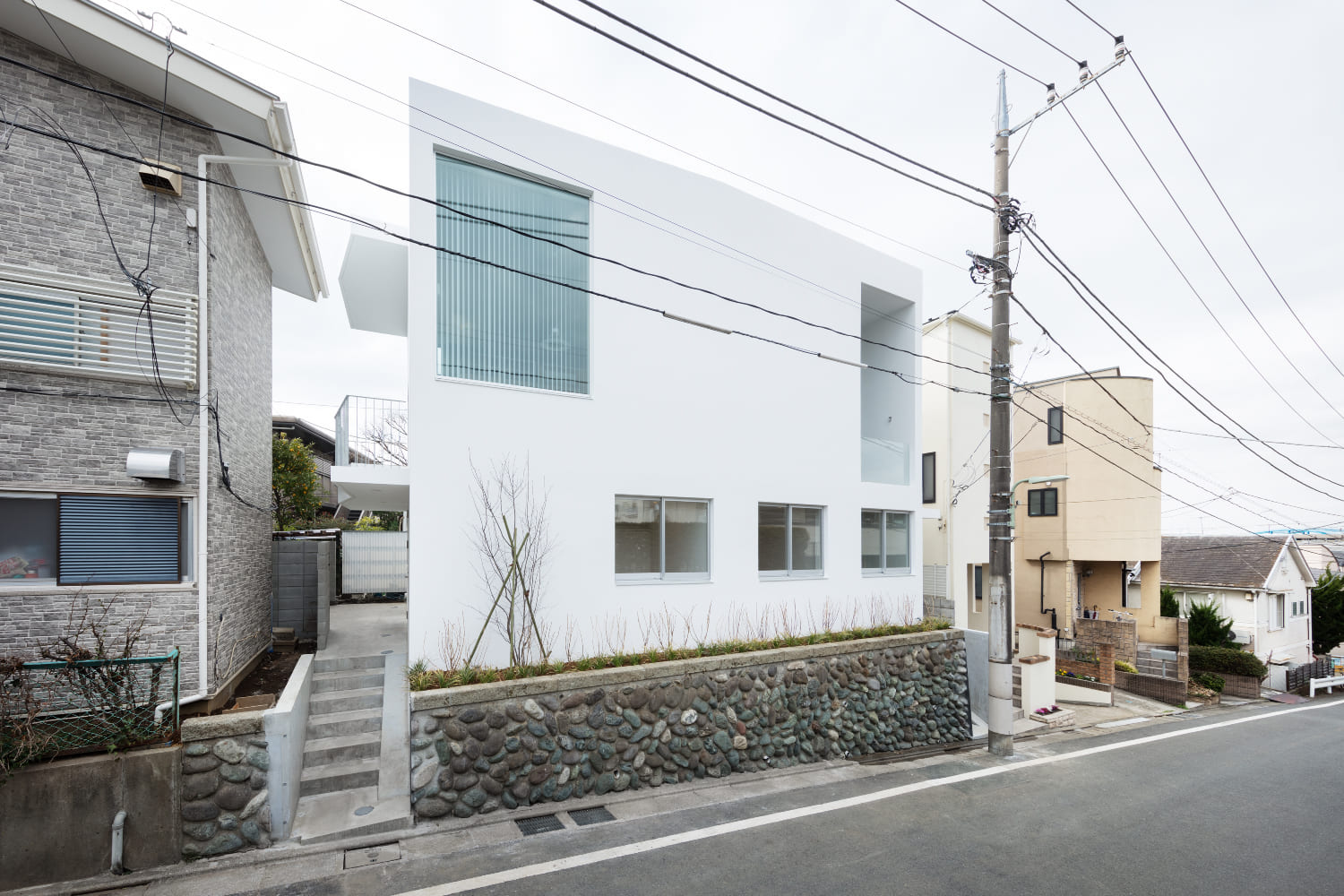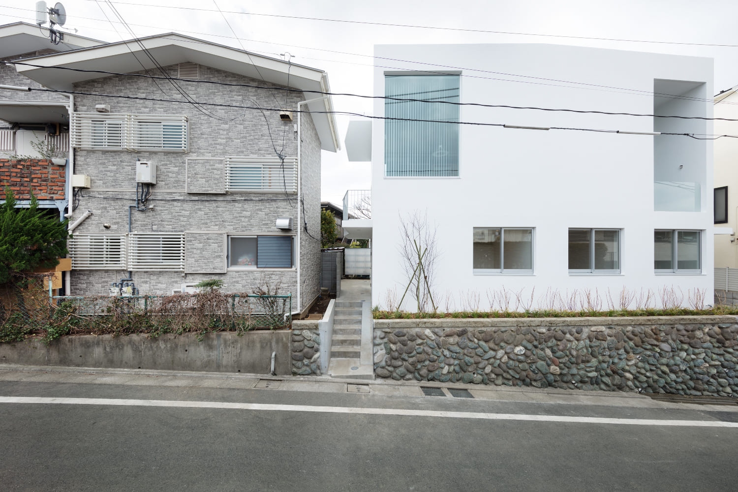 敷地は都内の閑静な住宅街で、坂の途中に位置している。傾斜のある道路に沿って高さ1.2m〜2.0m程の石垣がたち、その上を地盤面として既存の木造アパートが建っていた。これを建て替えるにあたり、長くこの一画に住んでいたオーナーは石垣を残すことと、新たに建つ建物の外壁は白であることを望んだ。街並みを構成する一つの要素として石垣を残し、これに対比させるよう真っ白なボリュームを配置することは新旧の対比ともなり、全体の方針として自然で大まかなイメージはすぐに決定された。