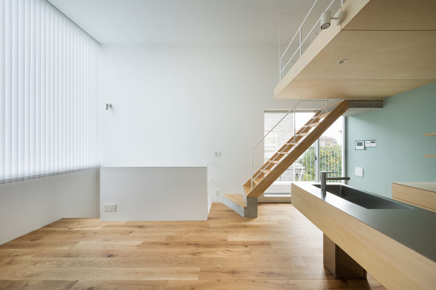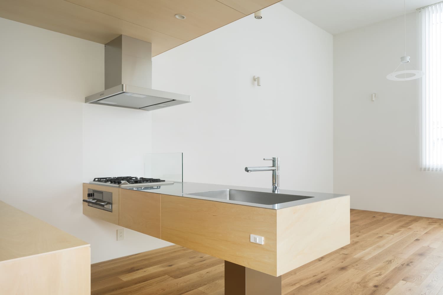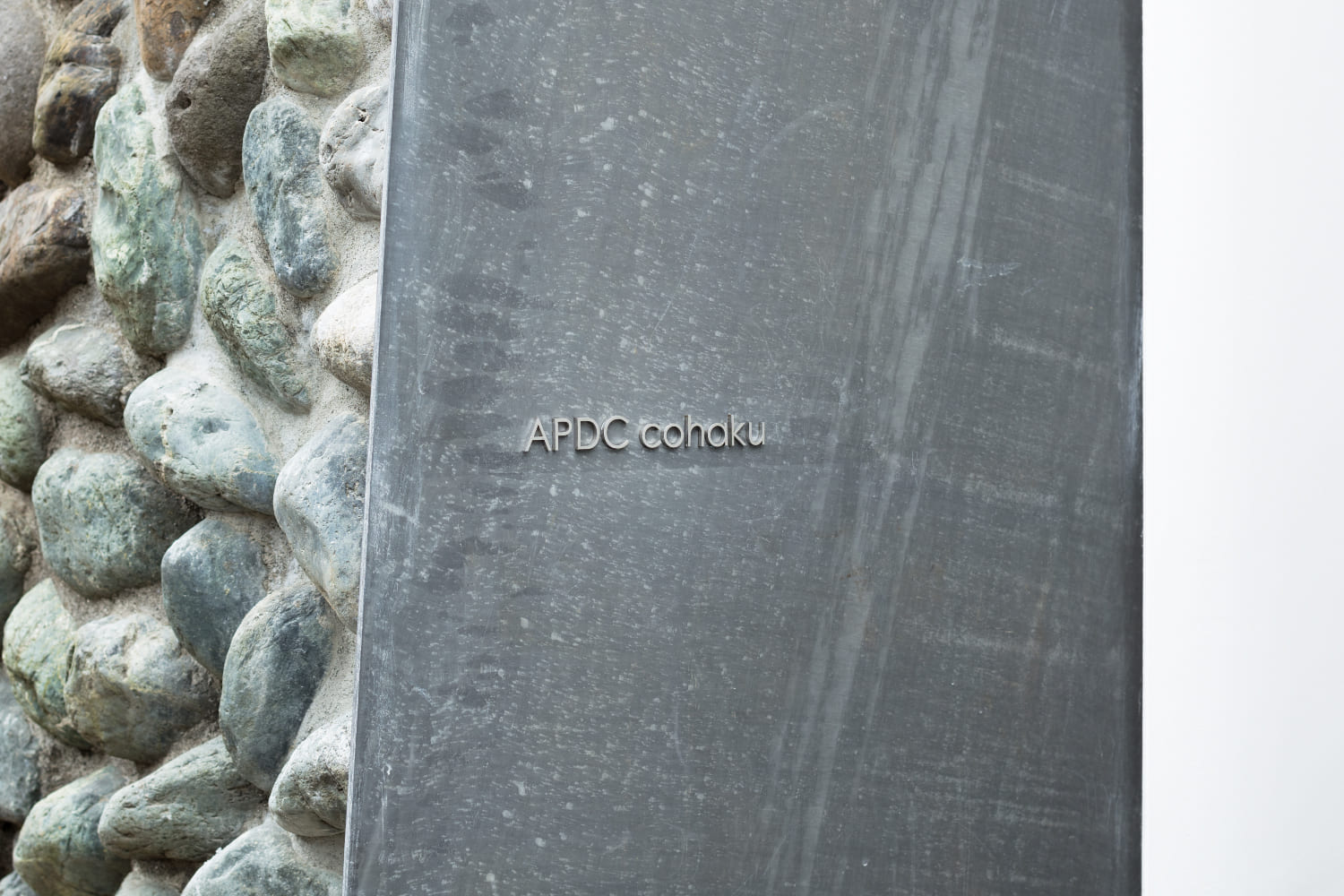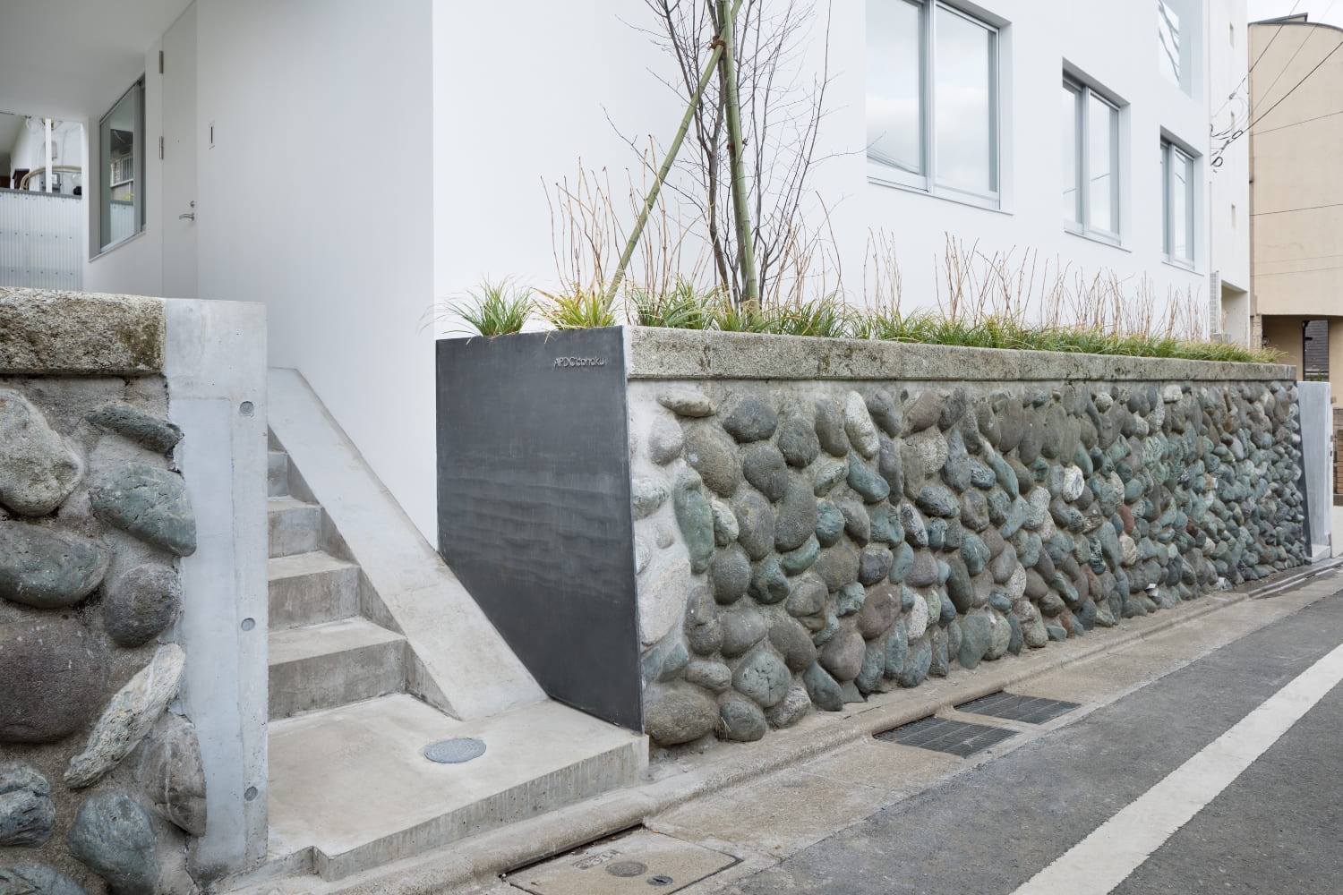 2住戸の小さな集合住宅で、いずれもメゾネットで床面積は60㎡、2階の天井高3,886mmとしてロフトを設け、都合70㎡程の広さとなる。この2住戸へのアプローチを道路境界線の両端にそれぞれ分けて長屋形式とし、そのためにカットした石垣はその切断面をリン酸処理を施した鉄板で押さえるディテールとしている。