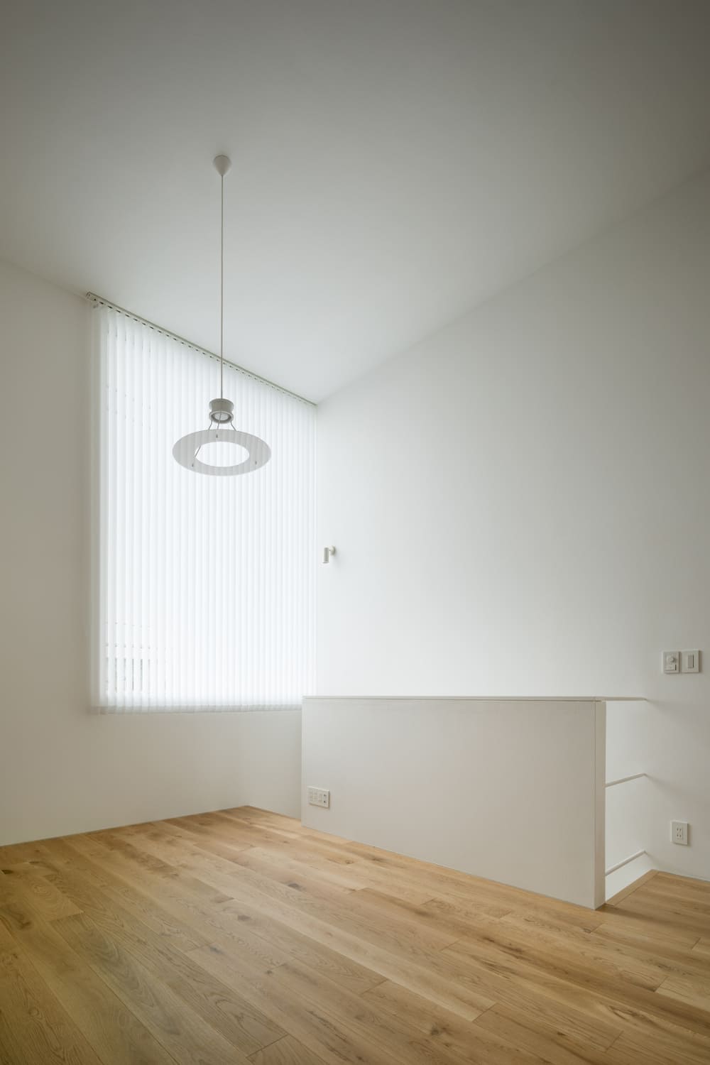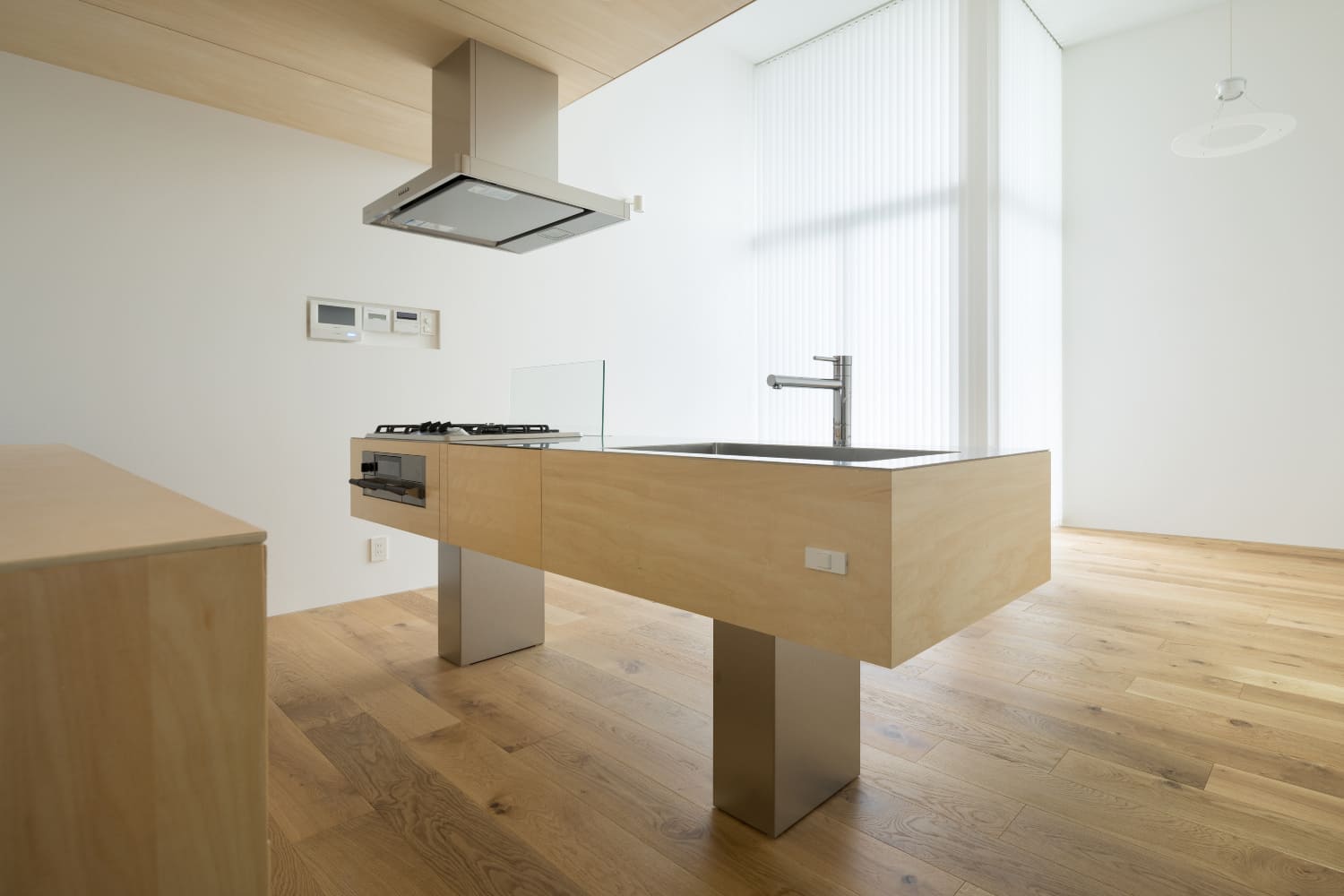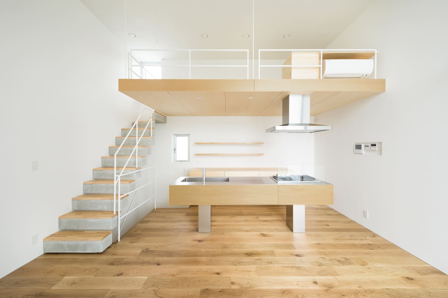 2住戸の小さな集合住宅で、いずれもメゾネットで床面積は60㎡、2階の天井高3,886mmとしてロフトを設け、都合70㎡程の広さとなる。この2住戸へのアプローチを道路境界線の両端にそれぞれ分けて長屋形式とし、そのためにカットした石垣はその切断面をリン酸処理を施した鉄板で押さえるディテールとしている。
