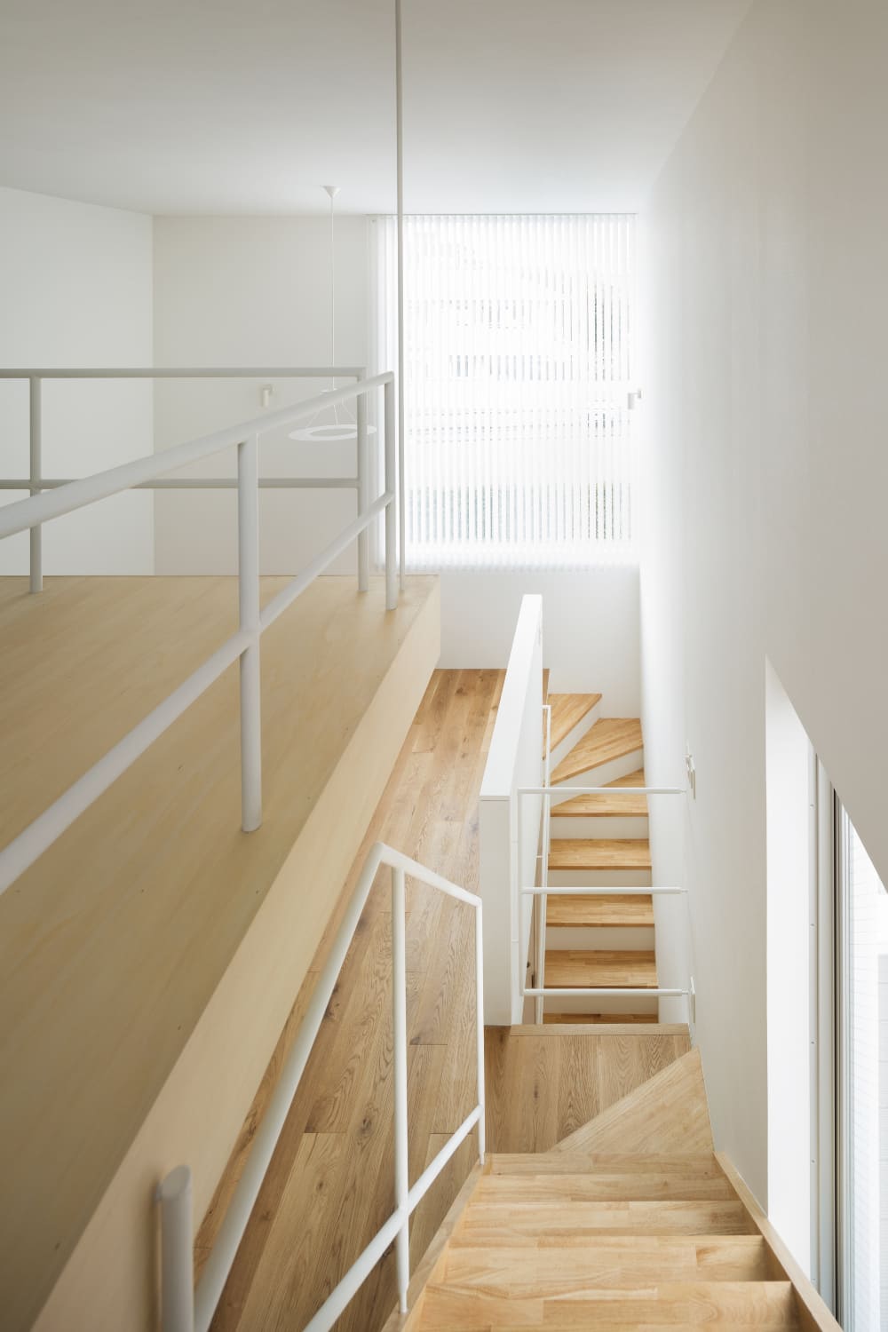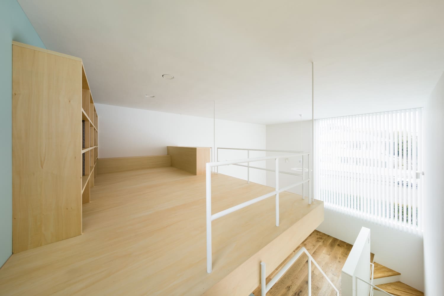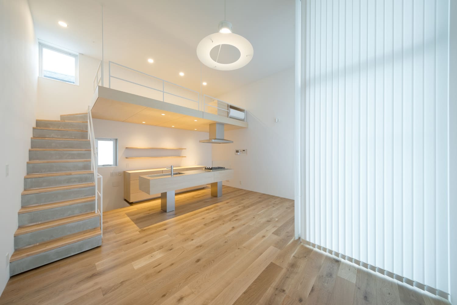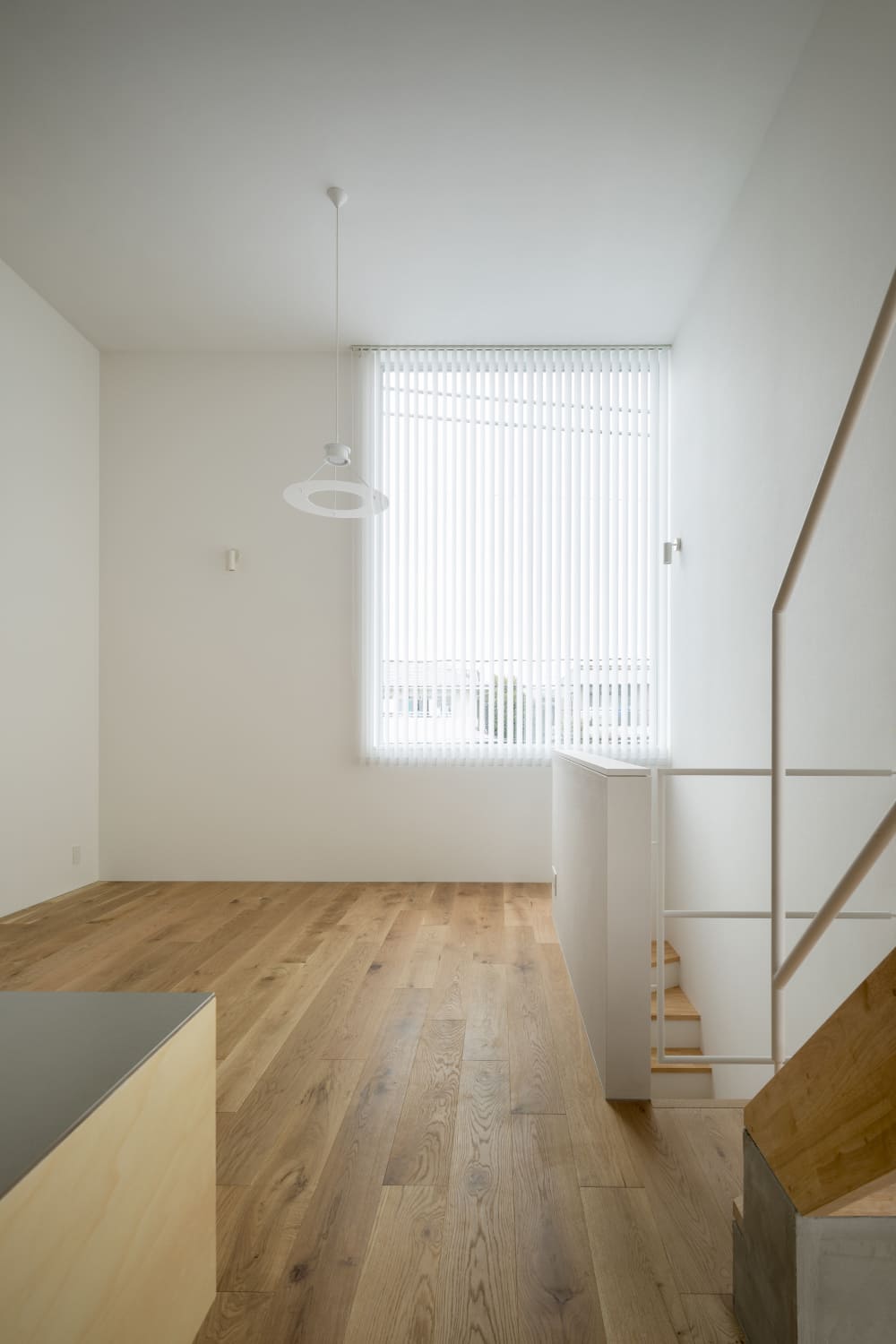 2住戸の小さな集合住宅で、いずれもメゾネットで床面積は60㎡、2階の天井高3,886mmとしてロフトを設け、都合70㎡程の広さとなる。この2住戸へのアプローチを道路境界線の両端にそれぞれ分けて長屋形式とし、そのためにカットした石垣はその切断面をリン酸処理を施した鉄板で押さえるディテールとしている。